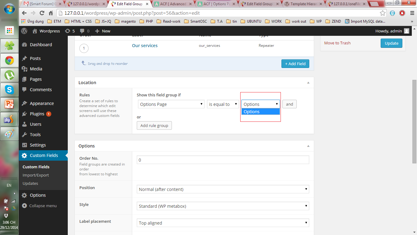 Tạo field giống như 2 phần trên, chỉ khác ở phần Show this field group if chọn Page Template chính là trang Service thay vì Default Template